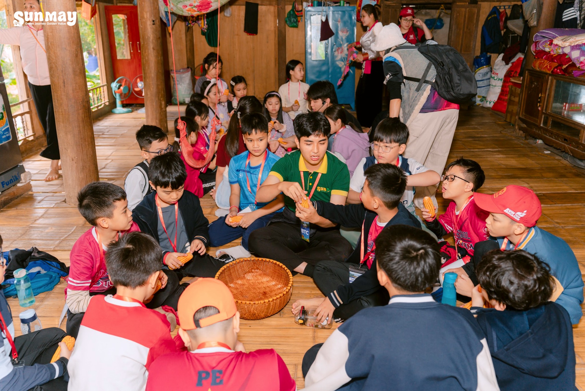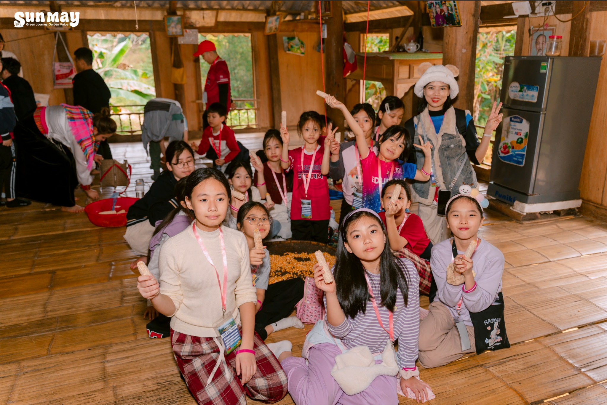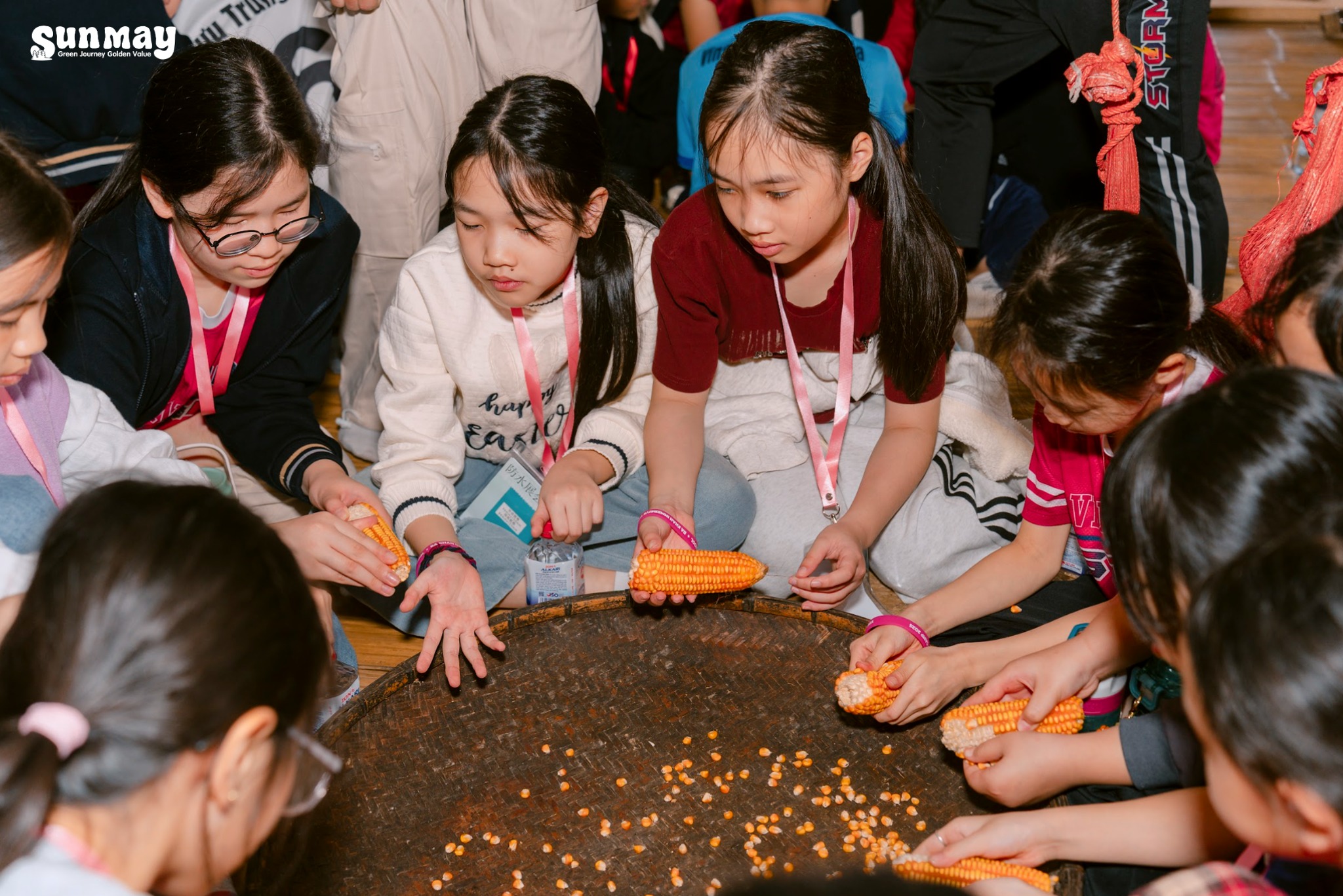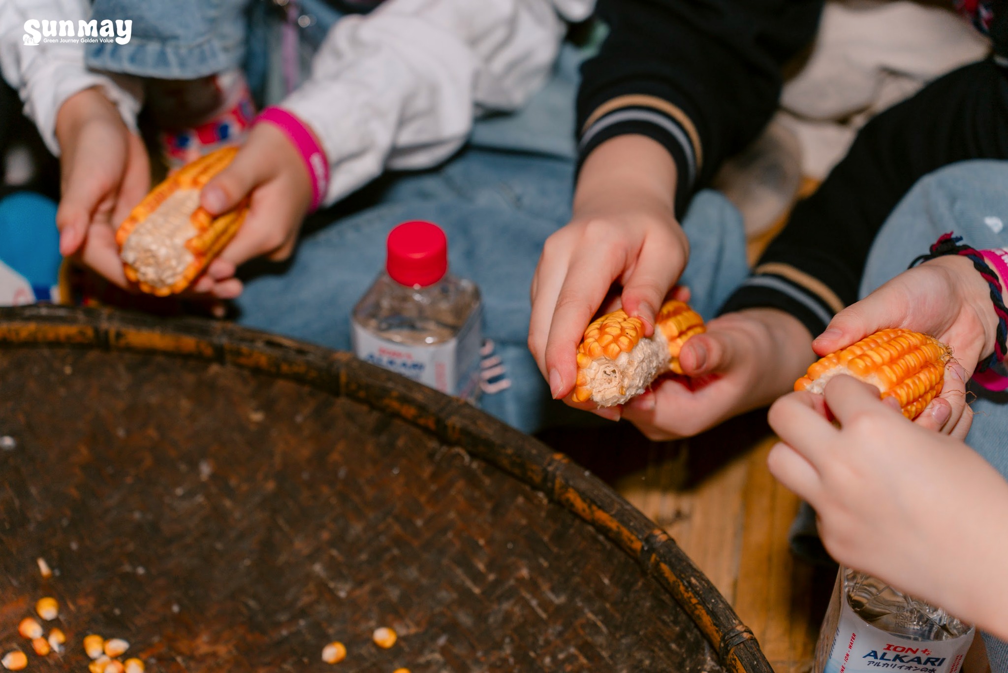 Các con theo chân người bản địa trekking qua những con đường núi, ghé thăm nhà sàn truyền thống, tìm hiểu nếp sống của người dân và tự tay học cách tách hạt ngô. Những trải nghiệm mộc mạc nhưng mới lạ đã mở ra cho các con một góc nhìn rất khác về cuộc sống vùng cao.