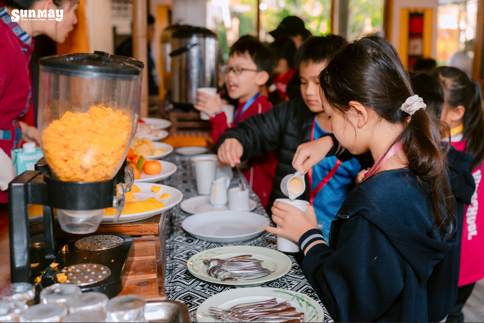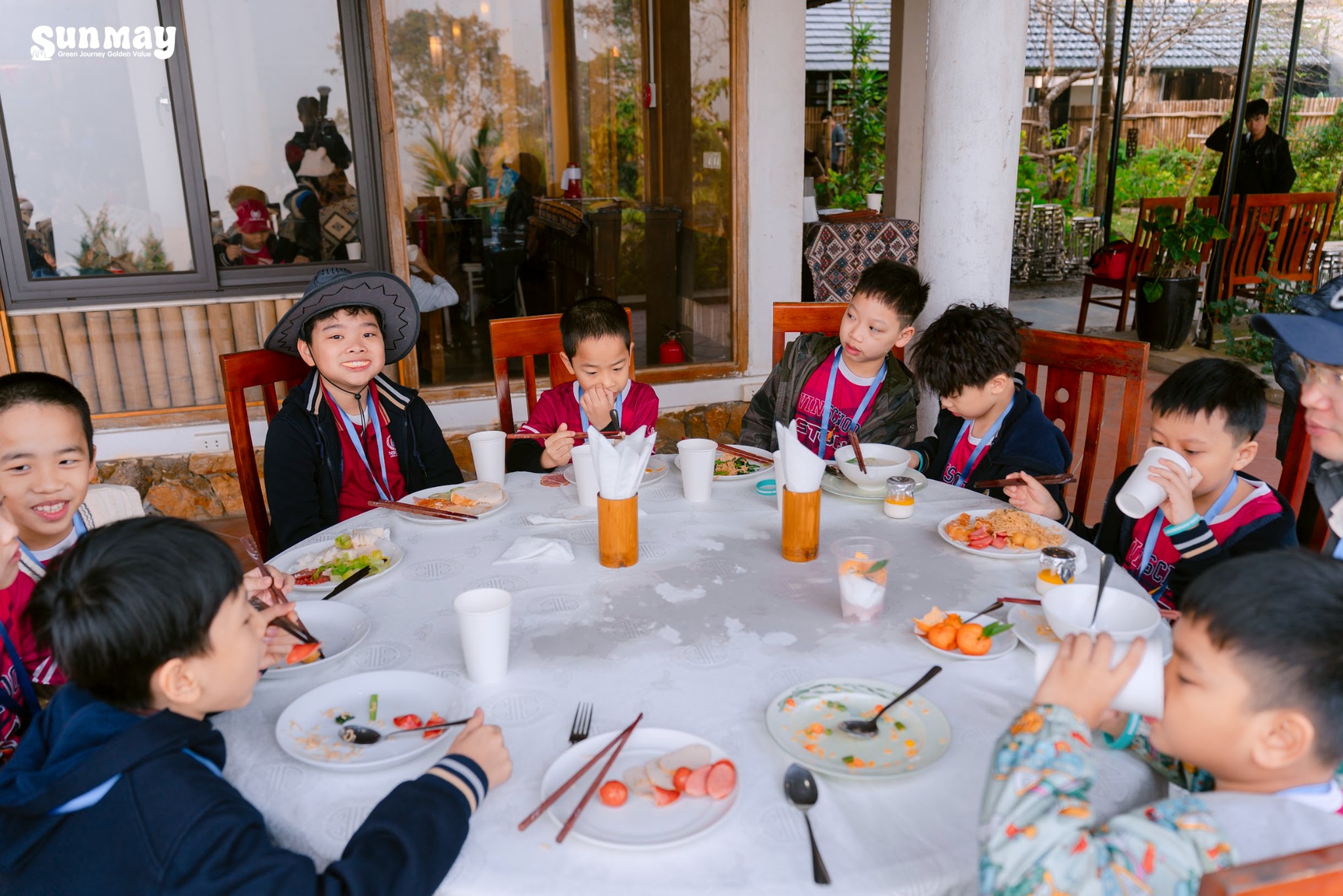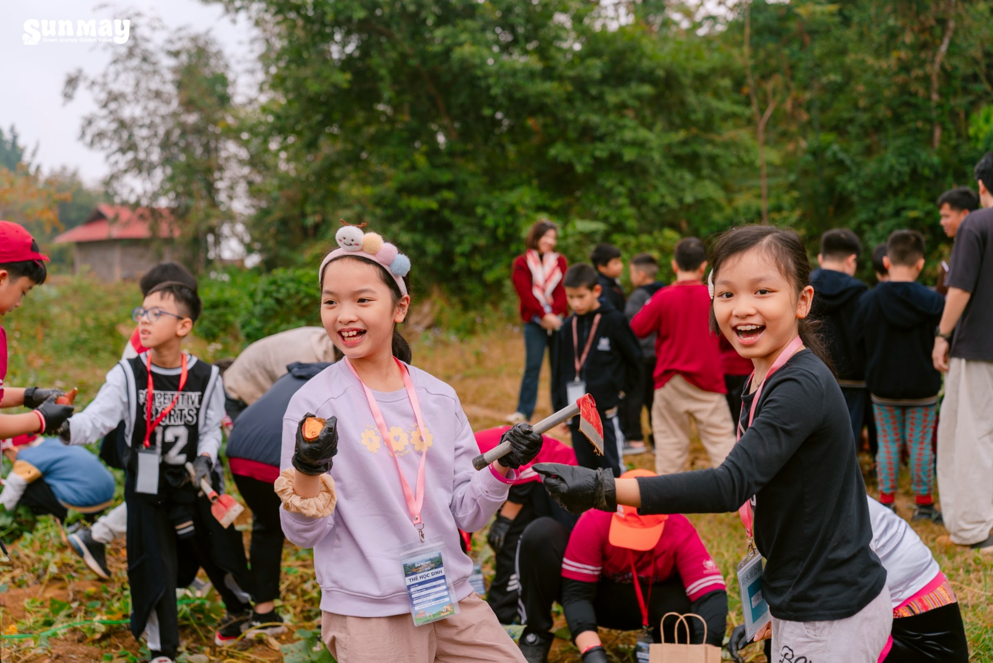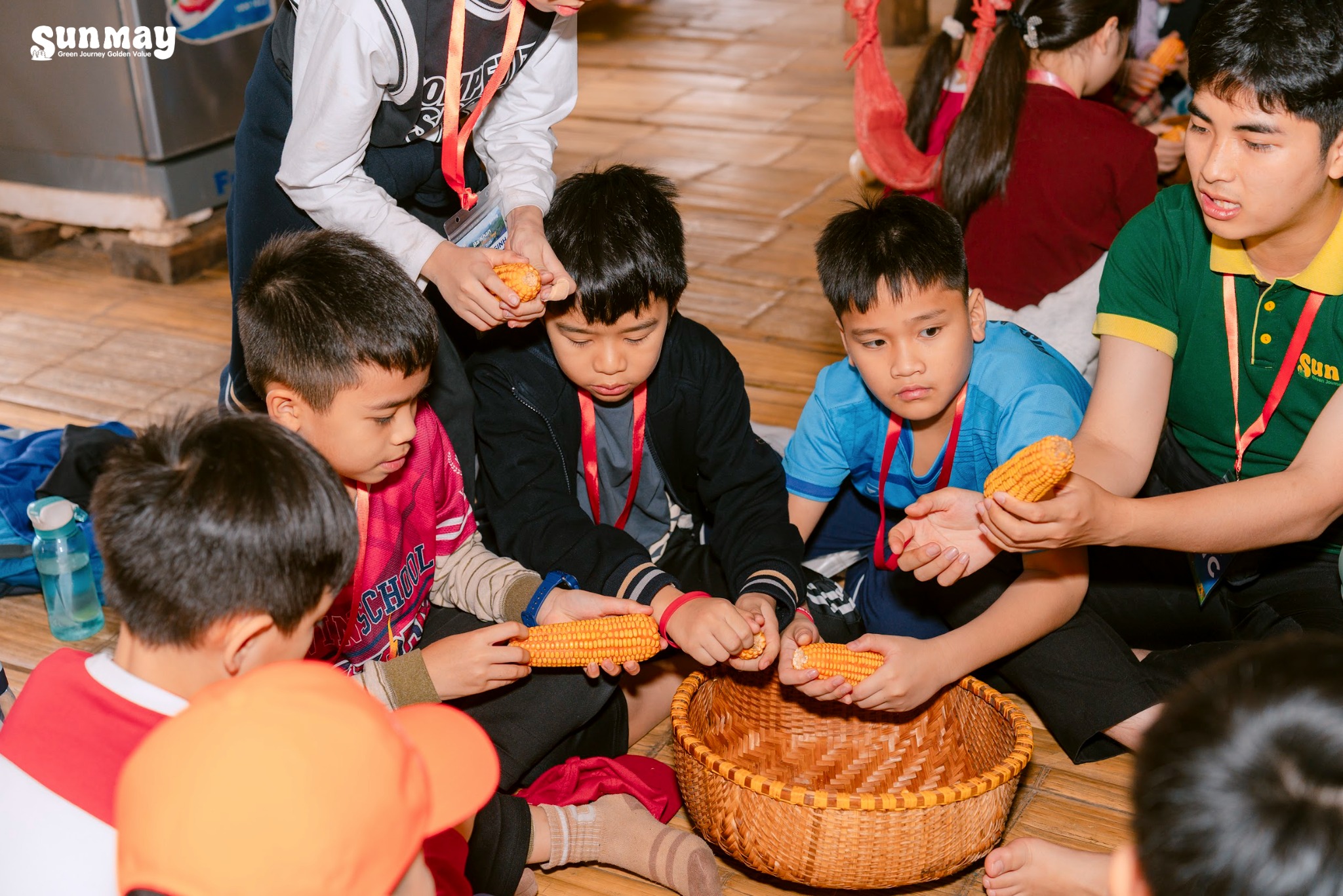 Các con theo chân người bản địa trekking qua những con đường núi, ghé thăm nhà sàn truyền thống, tìm hiểu nếp sống của người dân và tự tay học cách tách hạt ngô. Những trải nghiệm mộc mạc nhưng mới lạ đã mở ra cho các con một góc nhìn rất khác về cuộc sống vùng cao.