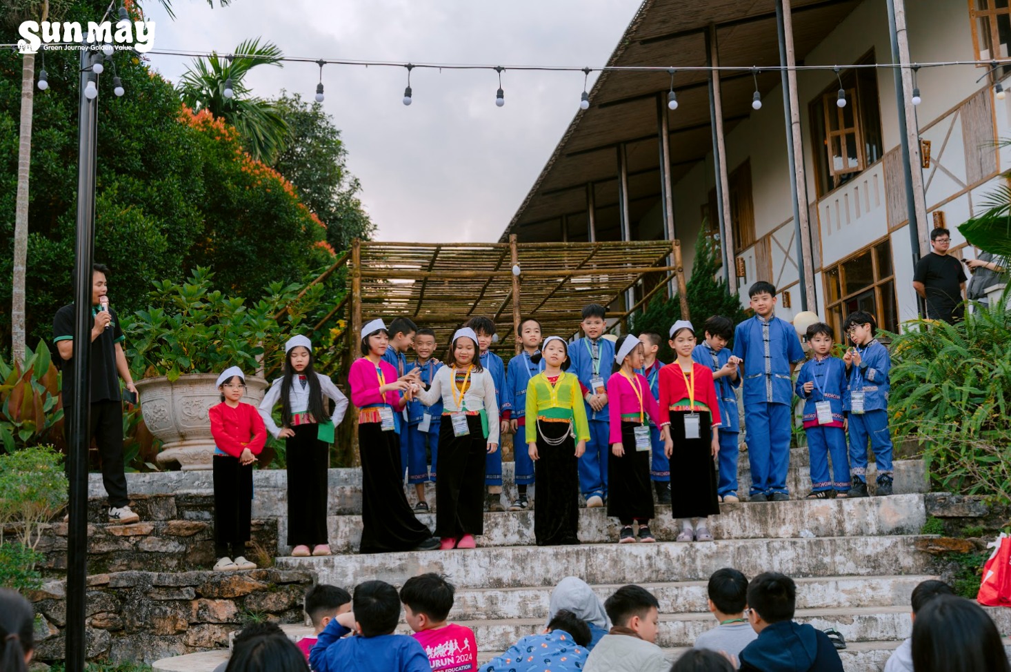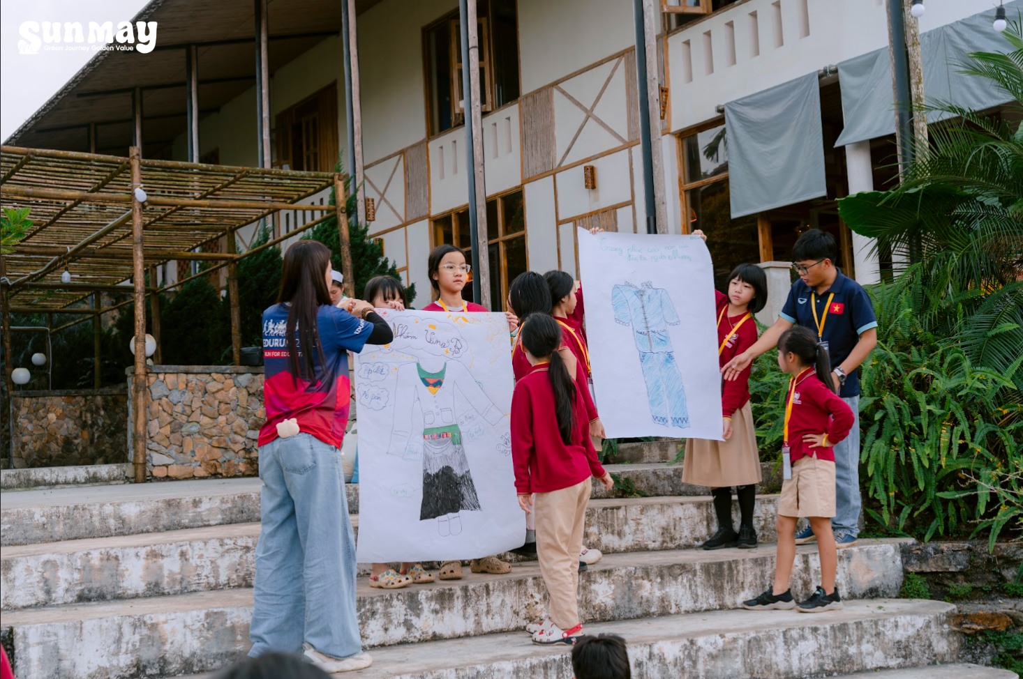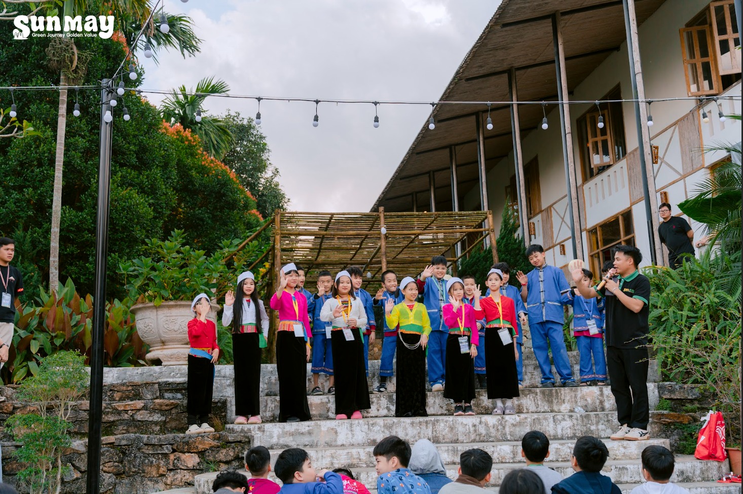 Các con còn được tìm hiểu về trang phục dân tộc người Mường, lắng nghe những câu chuyện văn hóa và chạm vào nét đẹp truyền thống bằng sự tò mò, trân trọng.