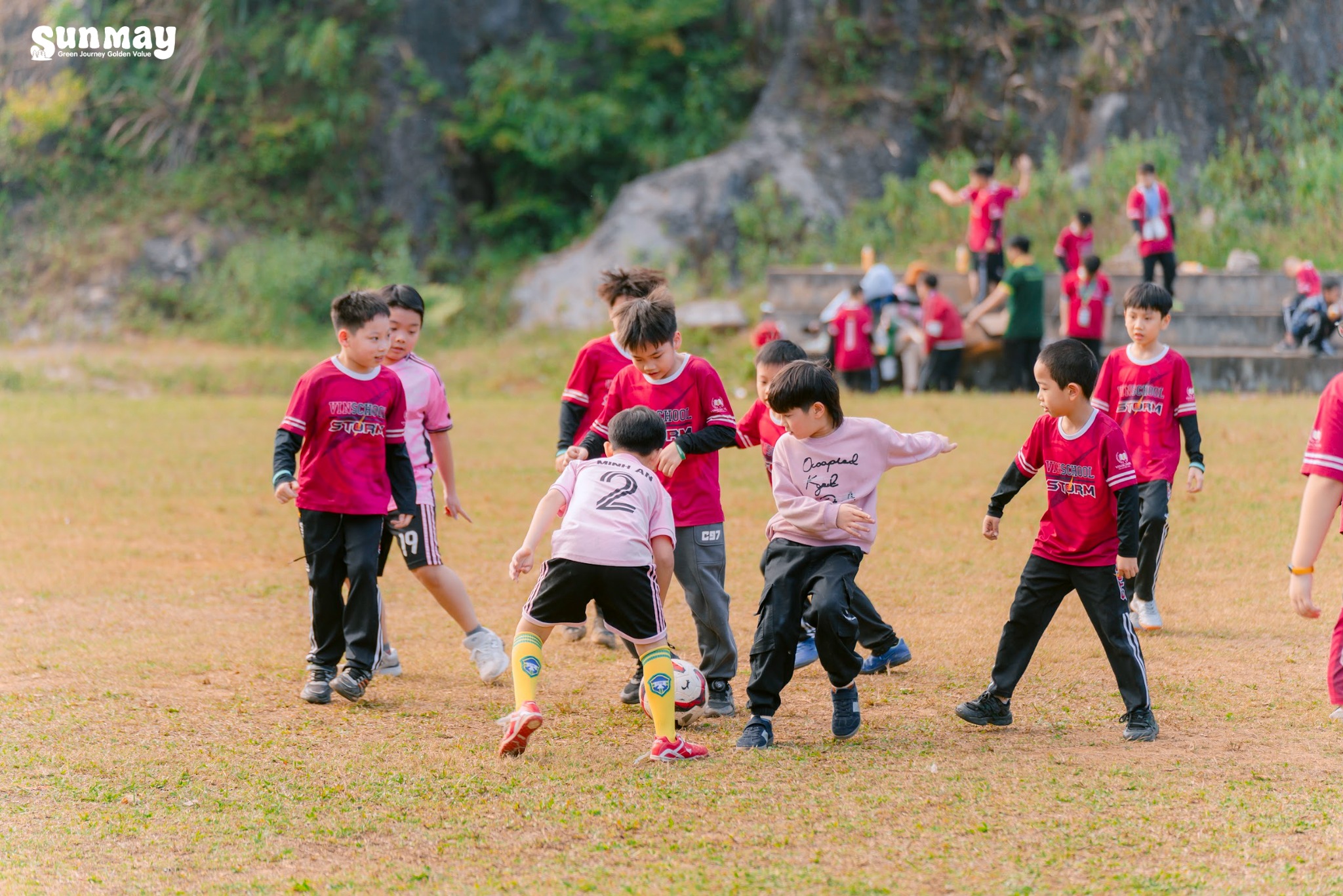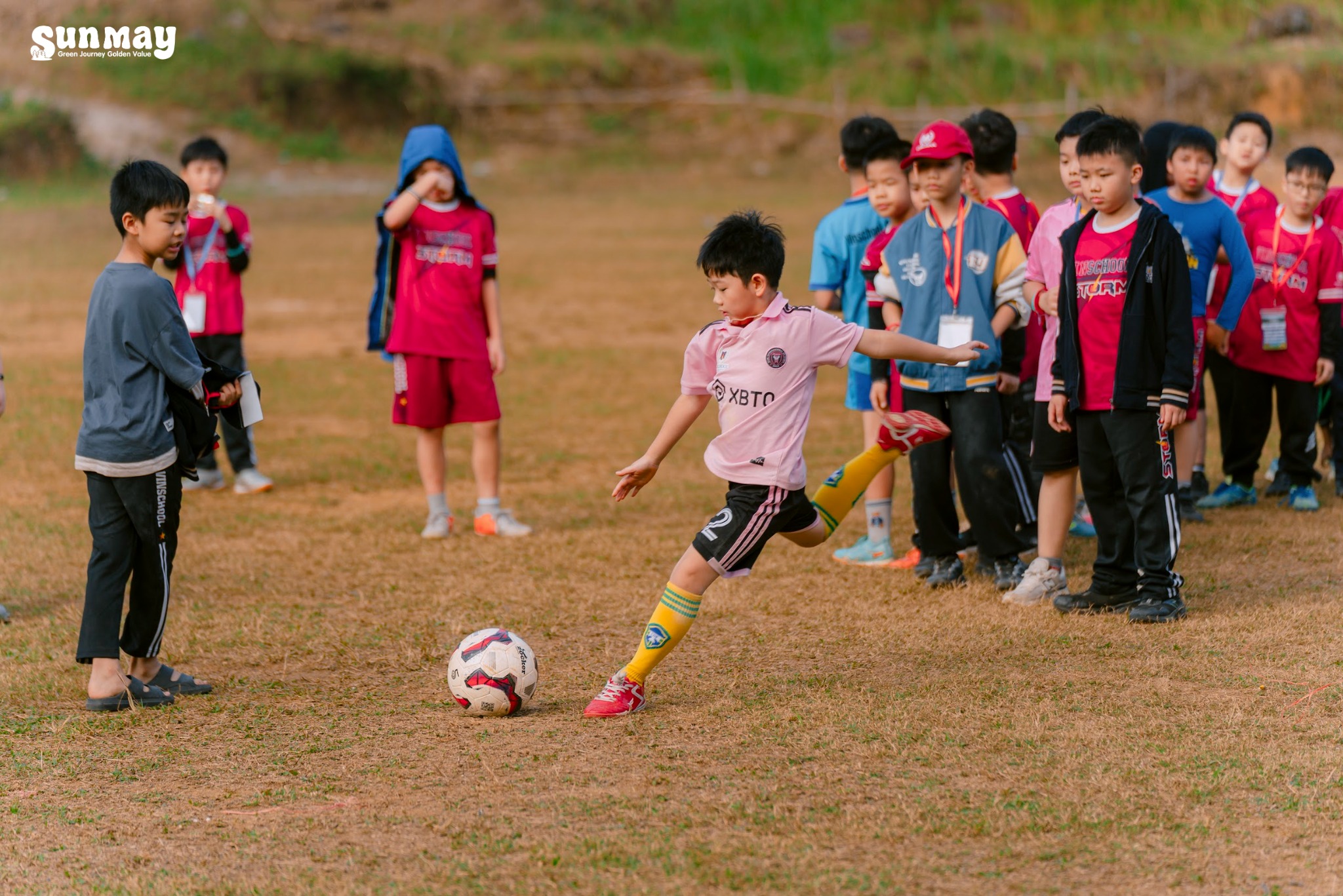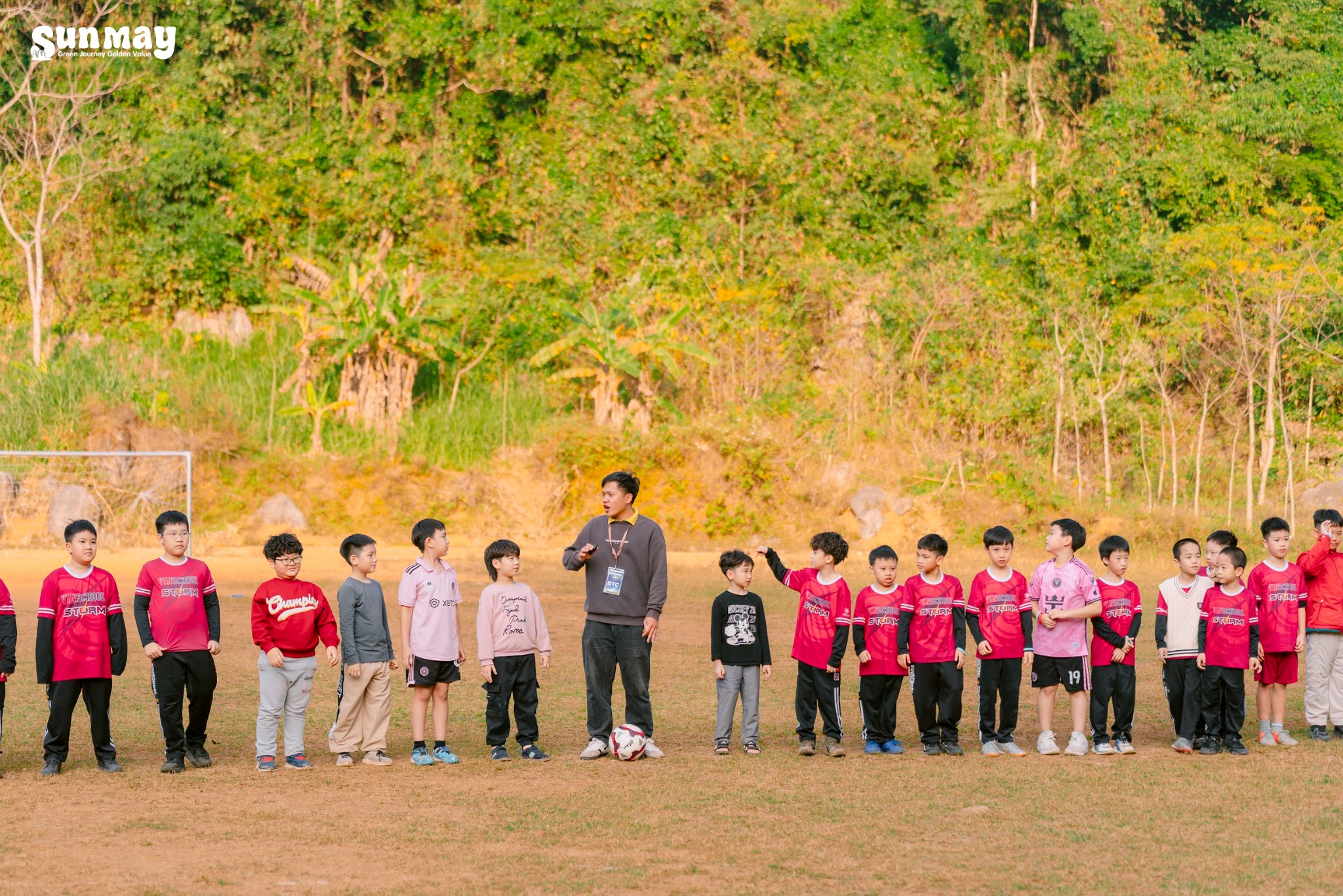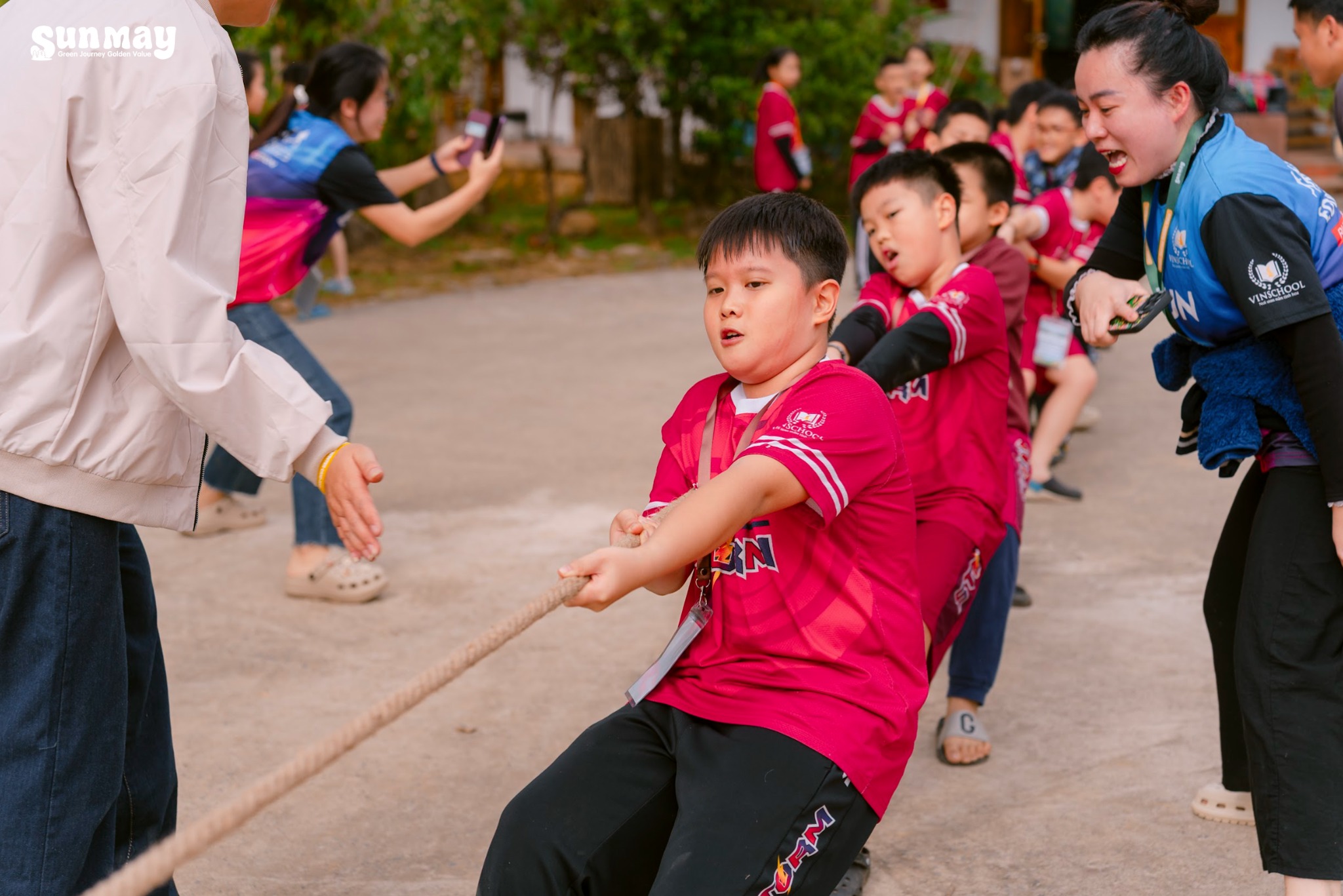 Không khí trại luôn sôi động với các hoạt động vận động và gắn kết: đá bóng giao lưu cùng các bạn học sinh Ba Khan, kéo co giữa các nhóm nhà, tiếng hò reo vang lên khắp sân trại.