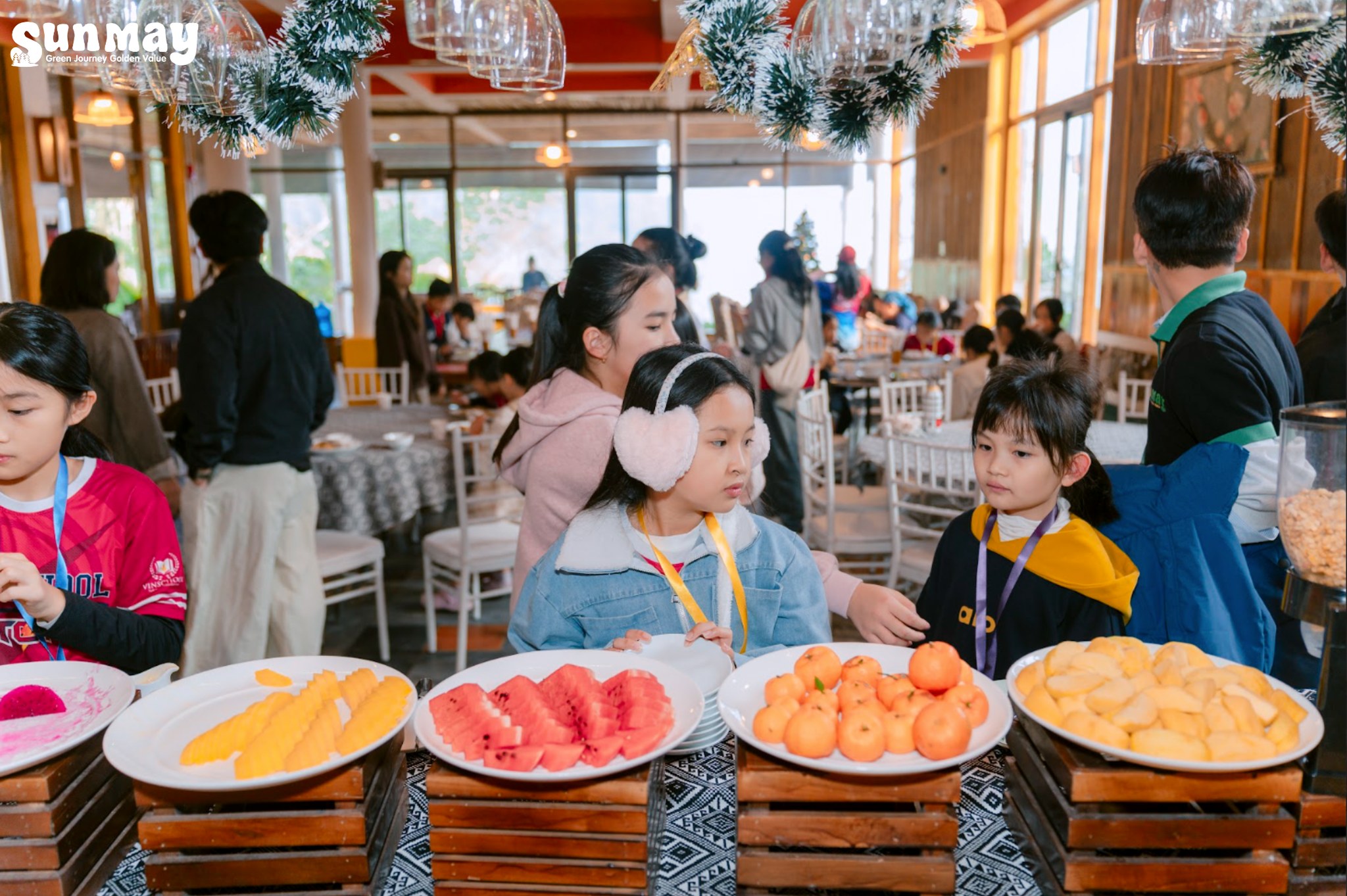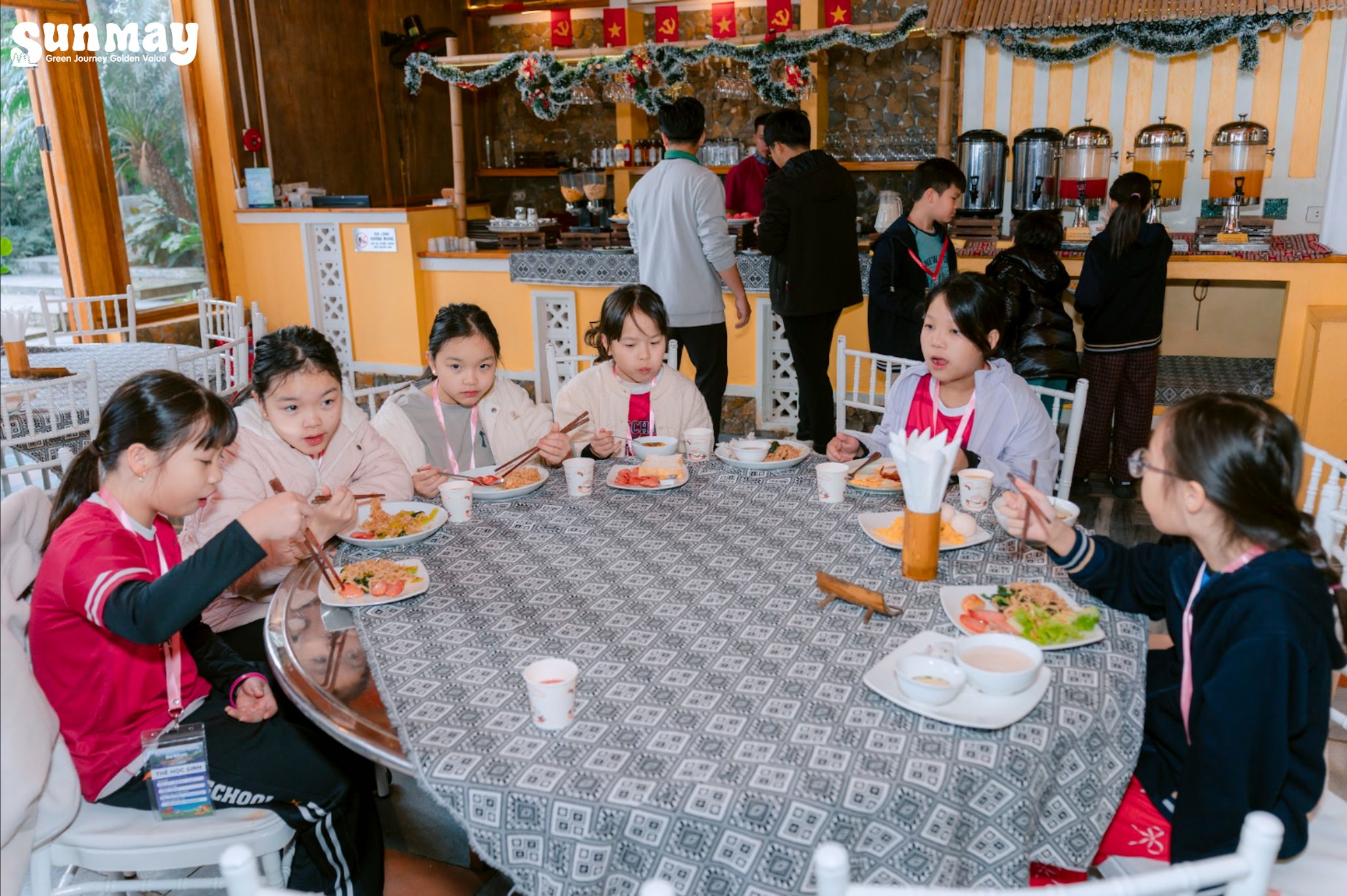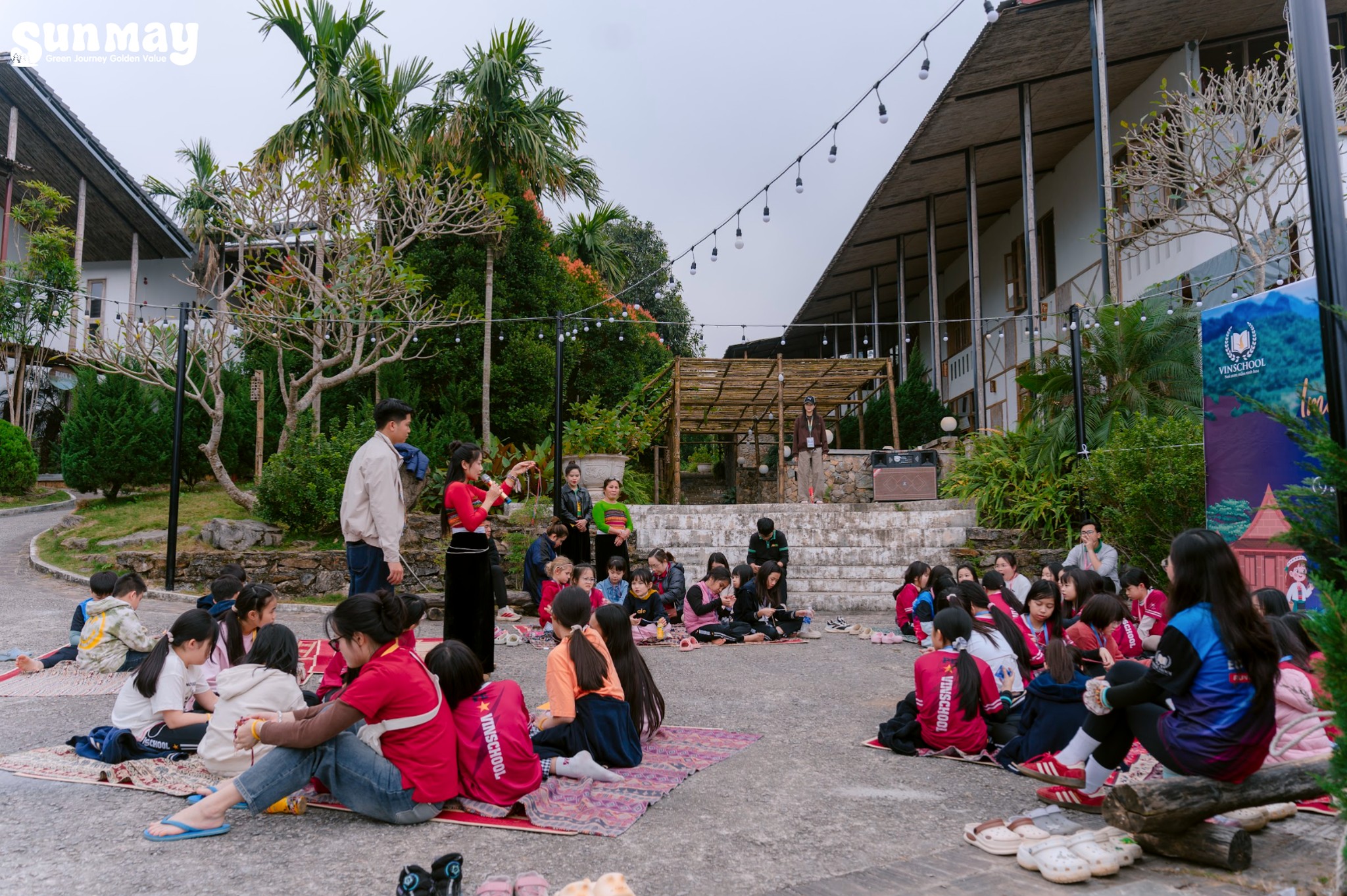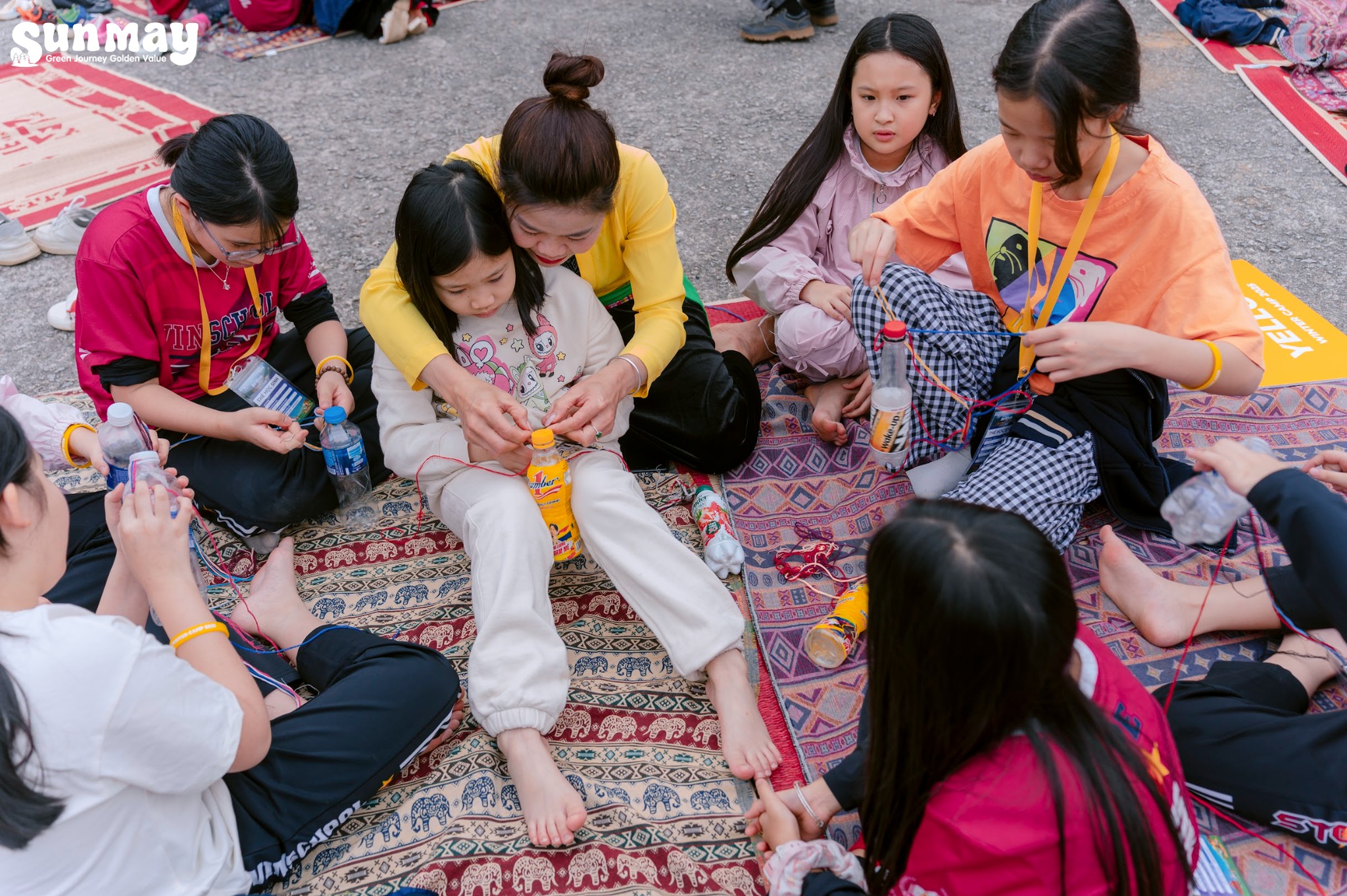 Buổi chiều, Sunmay lựa chọn nhịp hoạt động nhẹ nhàng hơn để các con có thời gian lắng lại. Hoạt động làm vòng thủ công được tổ chức với sự hướng dẫn tận tình của các cô người Mường, giúp các con không chỉ tạo ra một sản phẩm mang về, mà còn hiểu thêm về nét đẹp văn hóa và sự khéo léo trong sinh hoạt truyền thống của bản làng.