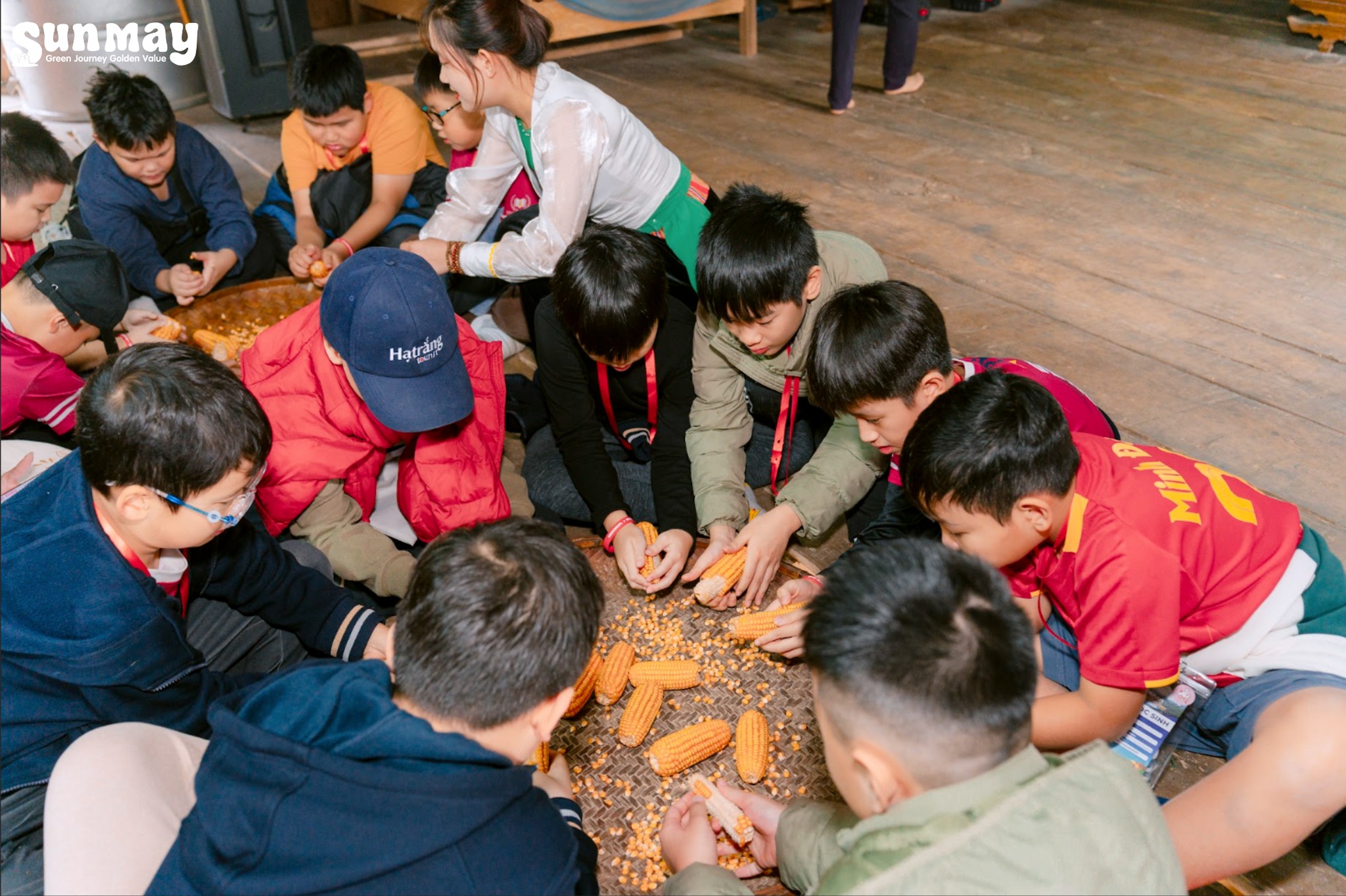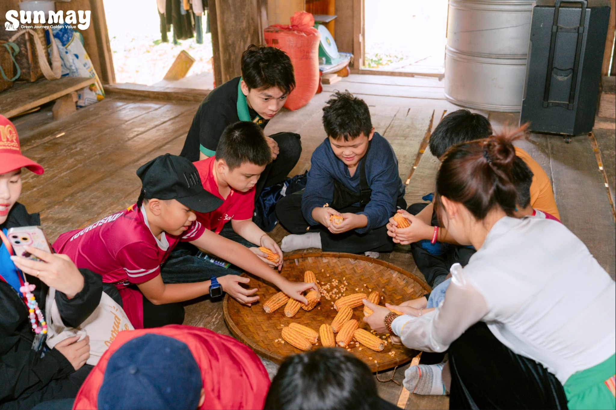 Buổi sáng, các con bắt đầu ngày mới bằng buffet sáng đầy đủ năng lượng, cùng nhau tập thể dục giữa không khí trong lành của núi rừng Ba Khan. Sau phần khởi động, đoàn bước vào hành trình trekking tới nhà sàn, nơi các con được trực tiếp trải nghiệm tách ngô – một công việc quen thuộc trong đời sống thường ngày của người dân nơi đây. Qua từng hạt ngô, các con học được sự kiên nhẫn, tập trung và trân trọng giá trị của lao động giản dị.