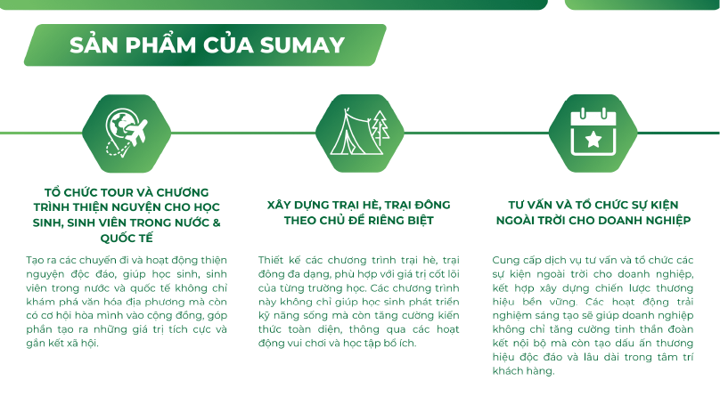 Sun May là đơn vị tiên phong trong lĩnh vực tổ chức các chương trình trải nghiệm giáo dục và du lịch bền vững, kết nối cộng đồng và tạo ra những giá trị tích cực cho xã hội. Chúng tôi mang đến những giải pháp độc đáo, được thiết kế riêng biệt, nhằm đáp ứng nhu cầu đa dạng của các trường học, tổ chức và doanh nghiệp.